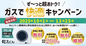 大好評につき延長決定!乾太くん月々200円の「ガスで快適キャンペーン」12月25日まで!