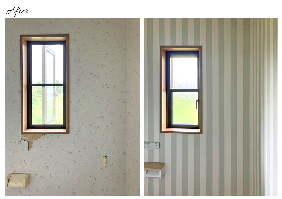 施工前はやさしい花柄で落ち着いた雰囲気でしたが、今回はグリーンのストライプを採用して清潔感のある明るい空間に。