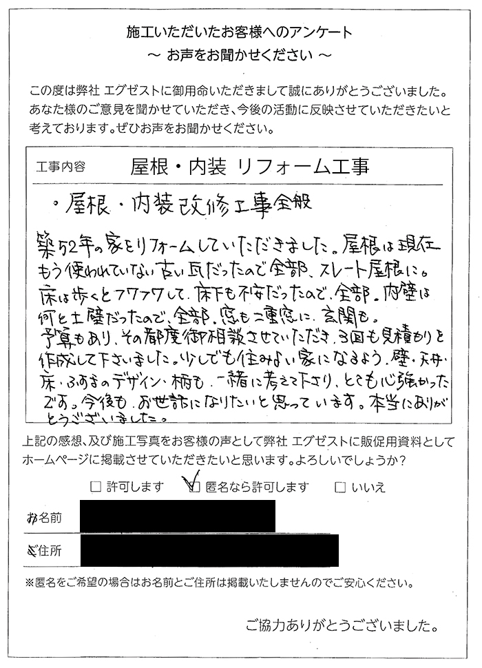 長い間空き家だった一軒家への居住を検討されていたお施主様よりリフォームのご相談いただき、屋根工事と内装リフォーム工事をいたしました。