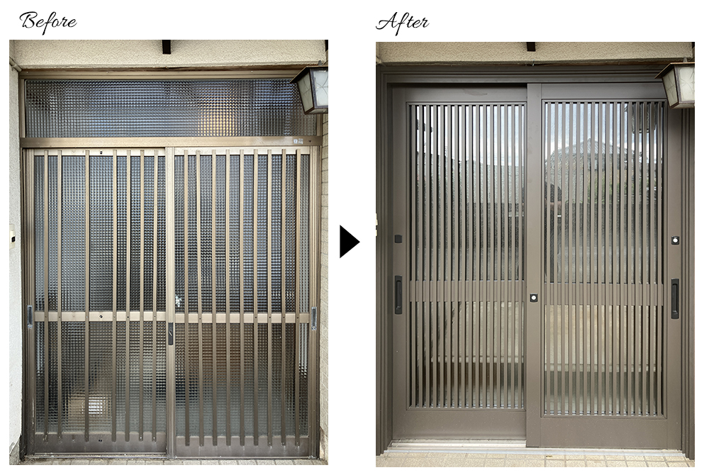 施工前は縦格子の桟が外れている部分があり、全体的に古さが目立つ状態でした。