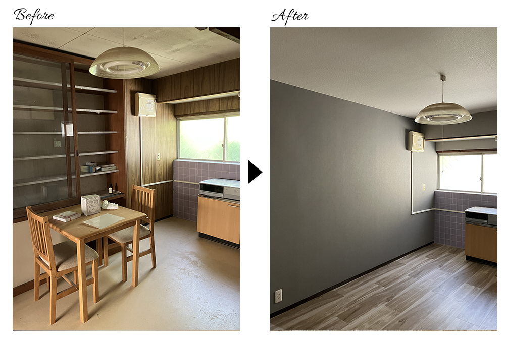 施工前にあった大きな食器棚を撤去し、壁にはダークグレーの石目調クロスを、天井には織物調の淡いグレーのクロスを施工しました。
