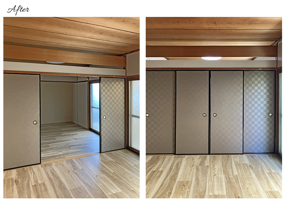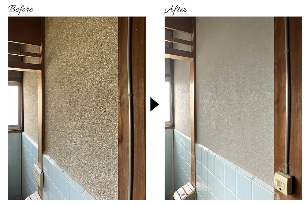 今回の施工ではこの綿壁をクロス(壁紙)仕上げにして、床材も新しくすることで、明るく清潔感のある空間へと生まれ変わりました。