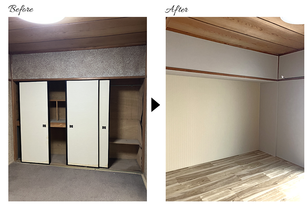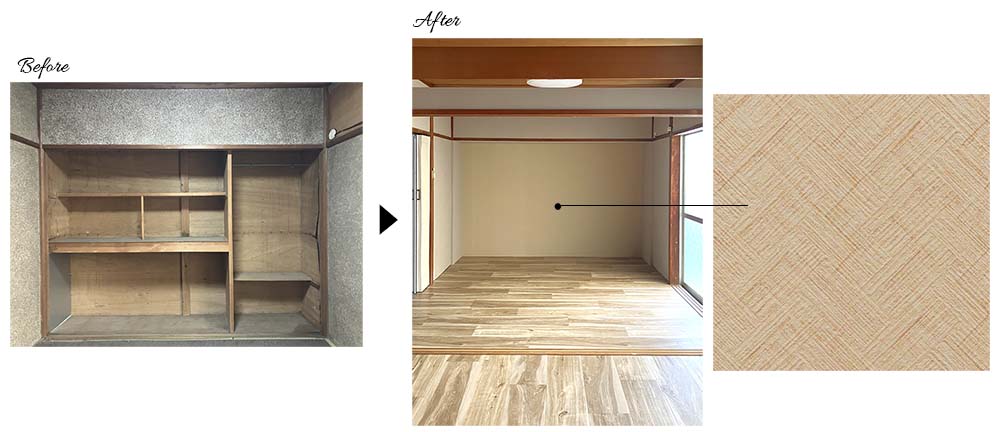 収納として使われていた棚板や建具を撤去し、和室にぴったりのアクセントクロスを貼りました。