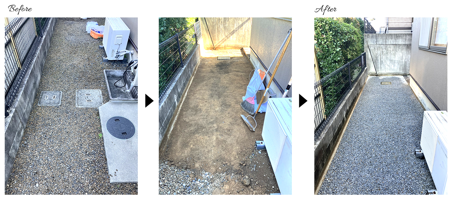 既存の砂利を全て撤去し、新しい砂利に入れ替えました。お話を伺ったところ防草対策は不要とのことでしたので、今回は防草シートの施工は行っておりません。