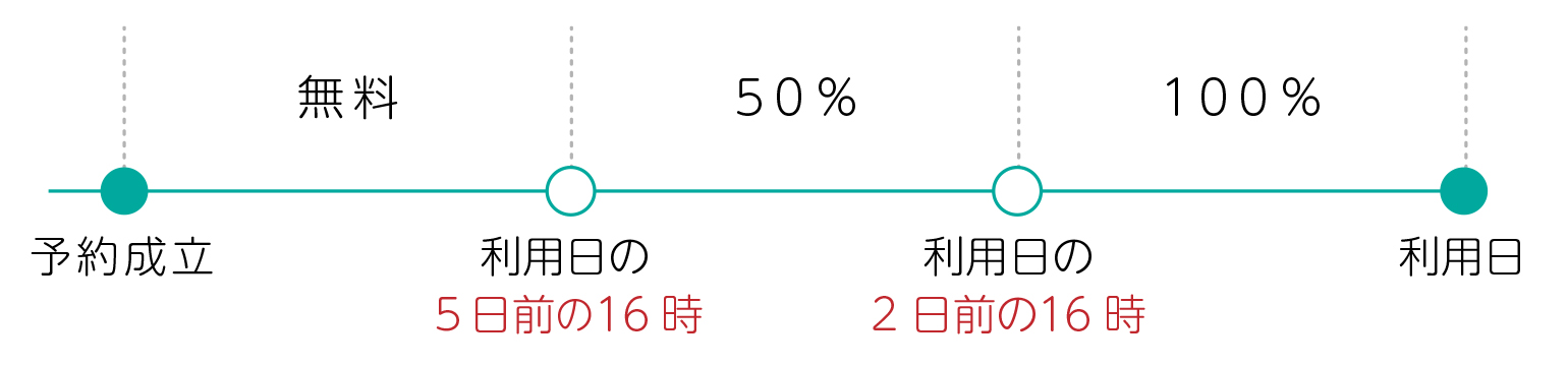 ・ご利用日の5日前16時以降のキャンセルにつきましては利用料金の50%を、またご利用日の2日前16時以降のキャンセルにつきましては利用料金の全額を申し受けます。