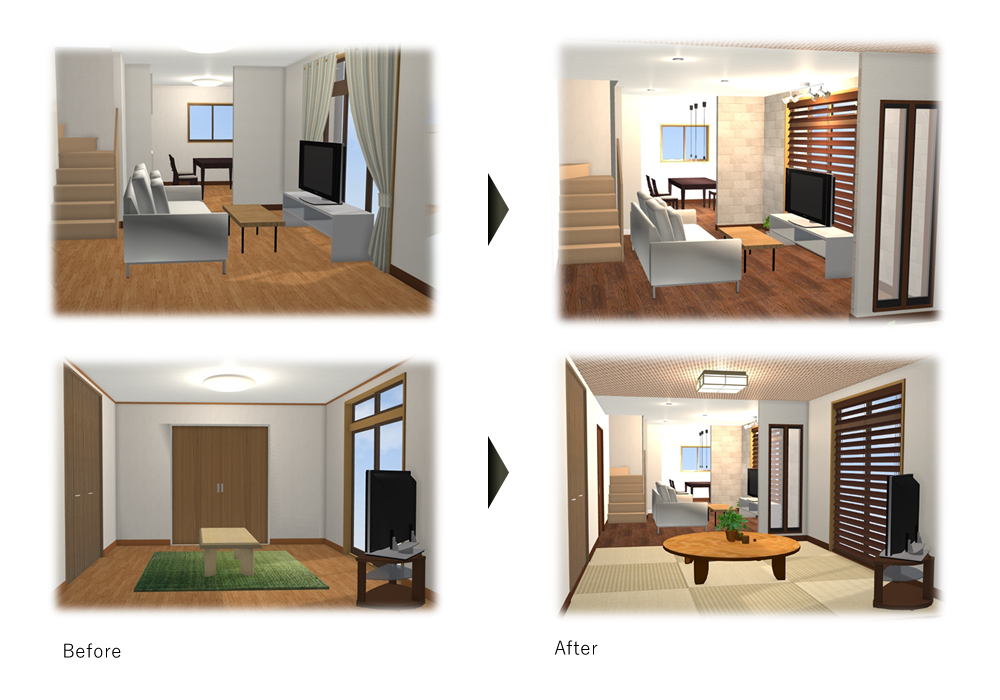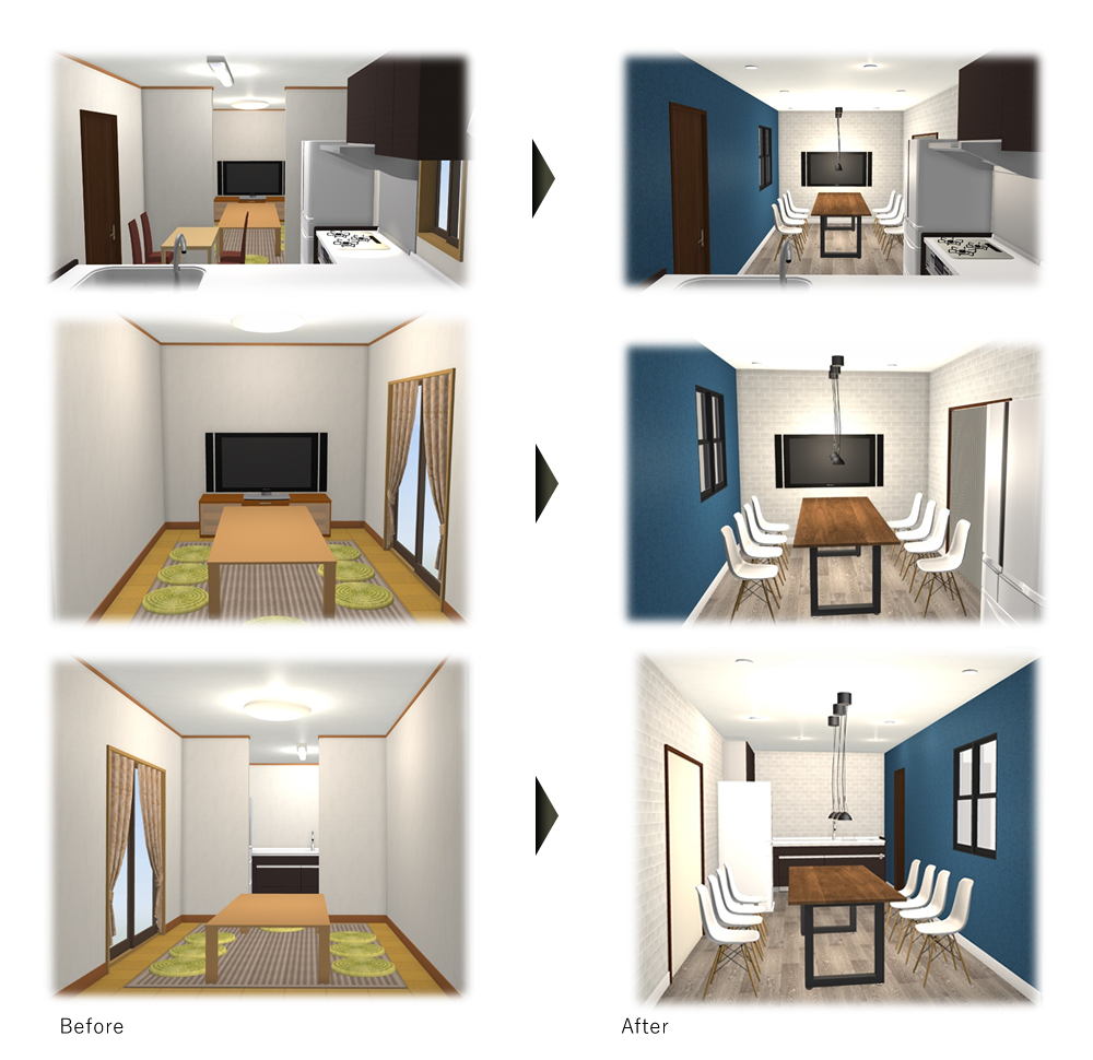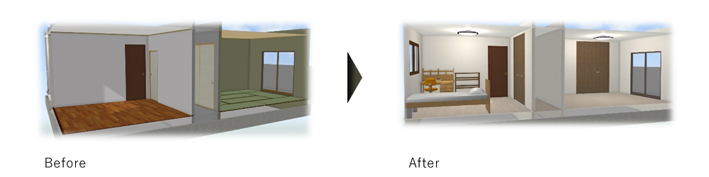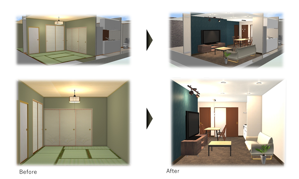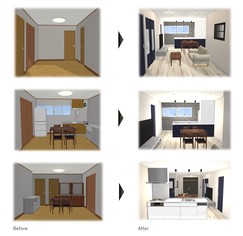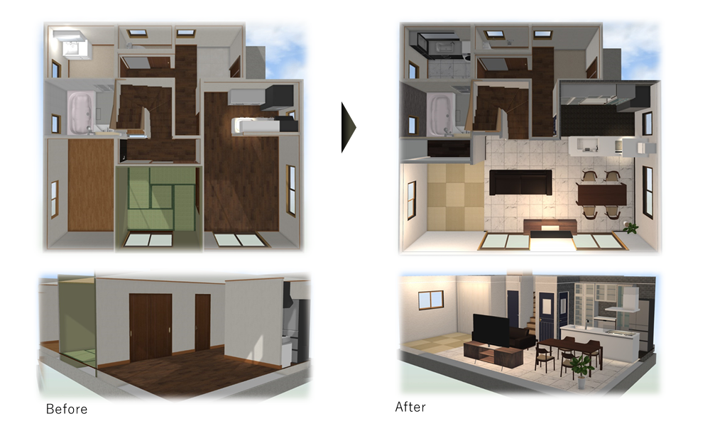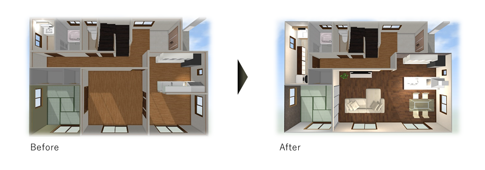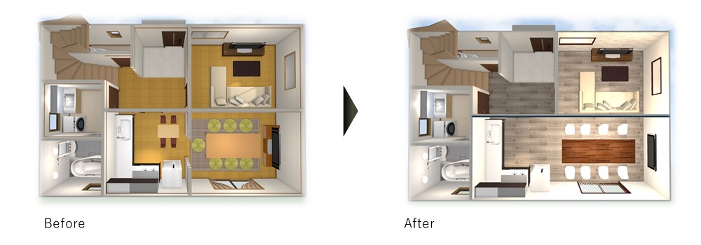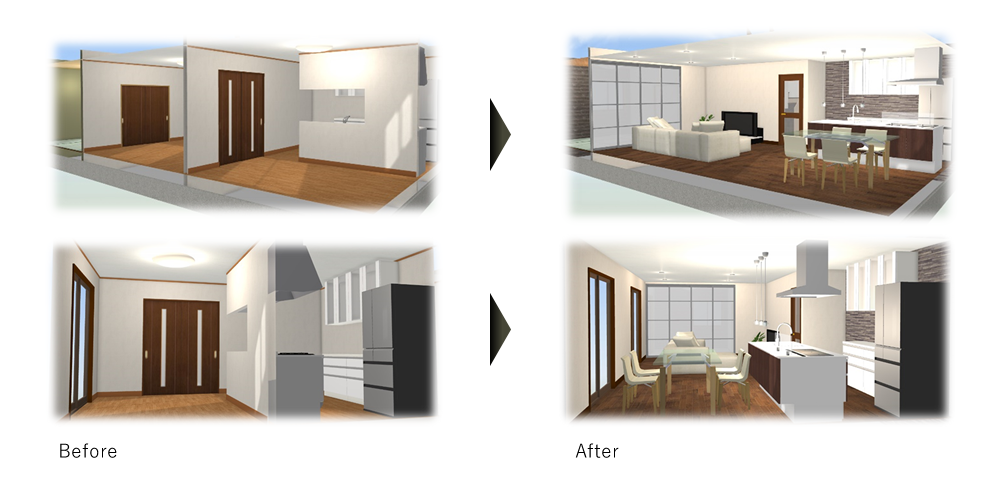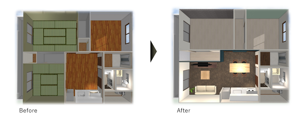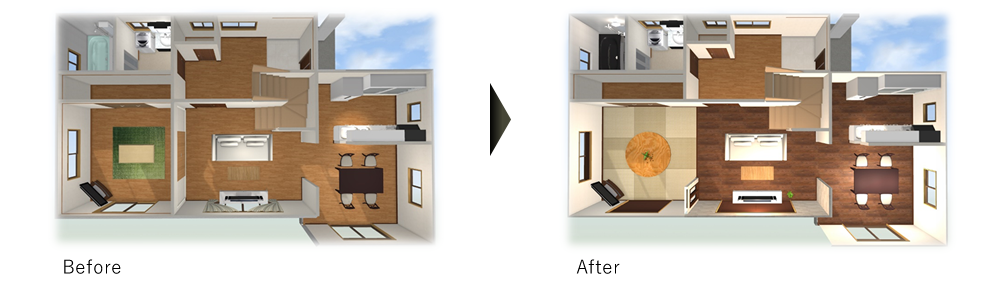 間取り変更などのリノベーションイメージを3Dによるパース図面で作成いたしますのでより一層