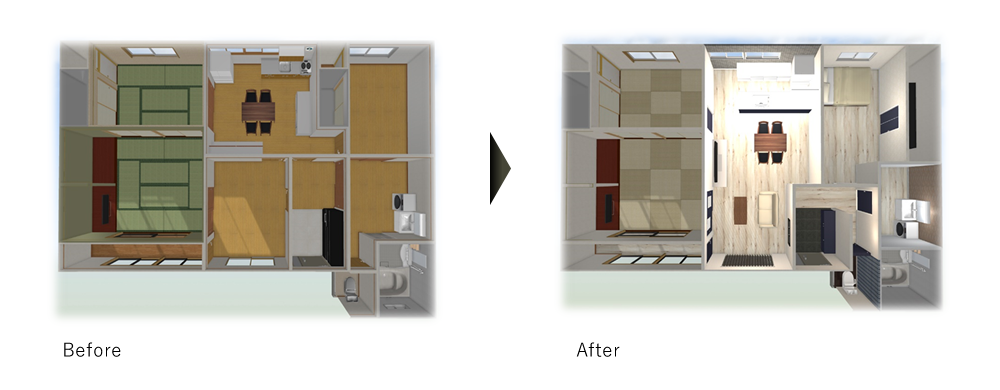 キッチンは間仕切り壁がありましたが、壁を解体しオープンなキッチンとなったので、料理をしながら部屋全体が見渡せるようになり小さなお子様の様子も見ながらのお料理が可能となりました。和室も移動しクローゼットも設置し、洋室と和室の壁を解体することで広々とした空間になり家族の団らんがより一層楽しい空間となりました。