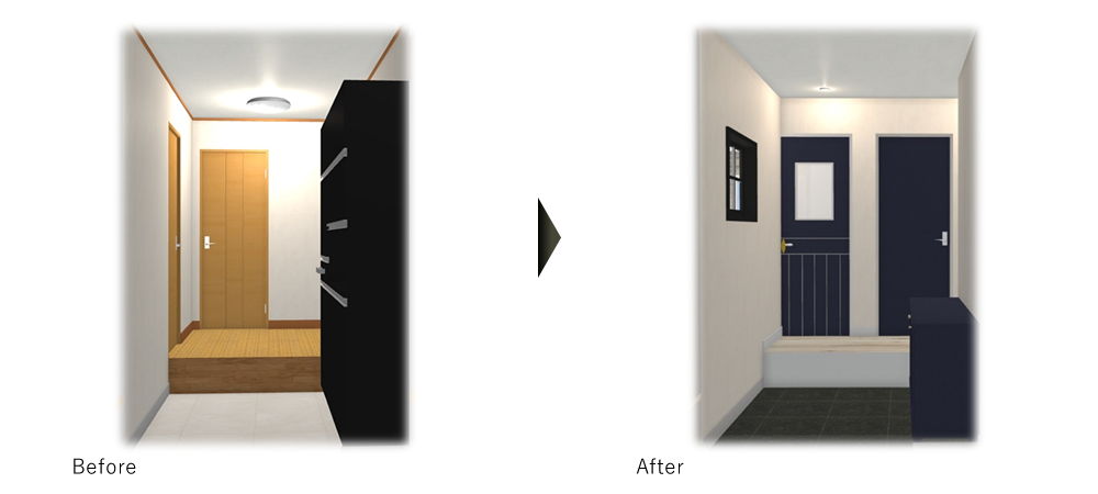 玄関は、下駄箱収納や、内装ドア(建具)、照明器具も変え、内装窓を取入れ、玄関土間・床・クロス(壁紙)も張替えて明るくおしゃれな玄関になりました。