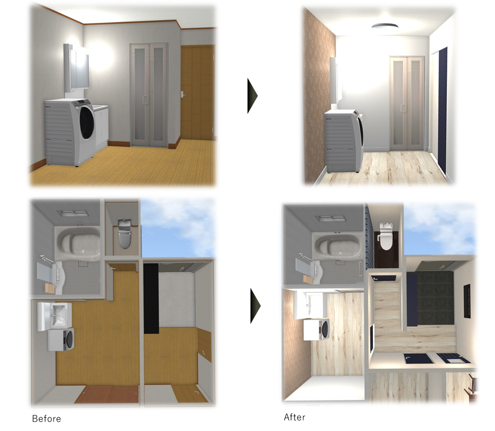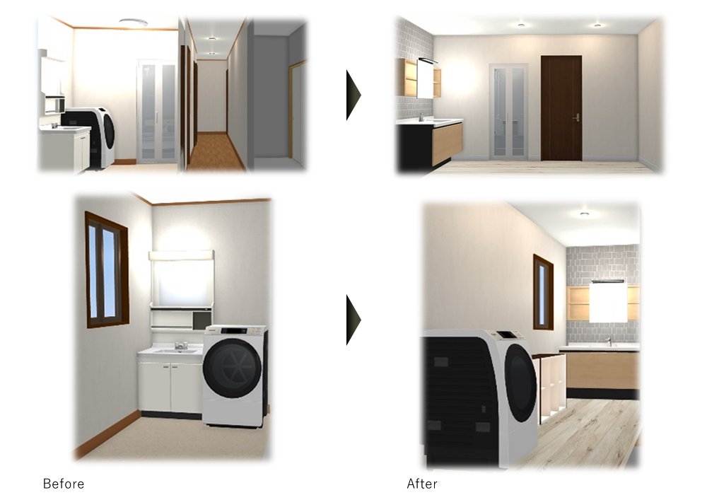 幅の広い洗面化粧台に変え、和室の押し入れや、廊下を一部解体し、洗面室を広げランドリールームを作りました。