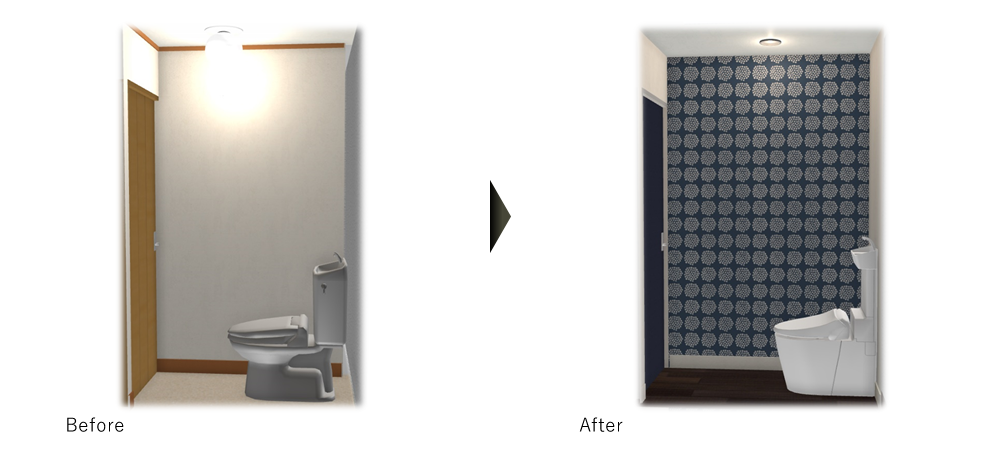 トイレは、便器を新しく取替え内装もマリメッコ柄のアクセント(デザイン)クロスを取入れるなどして雰囲気がとても変わりました。