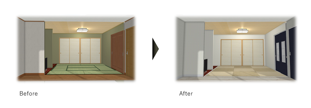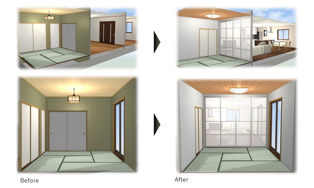 圧迫感をなくしたストレスフリーな畳のある空間にリノベーションしました。リビングと和室が一体となった空間になったのでご家族の会話も増えました。