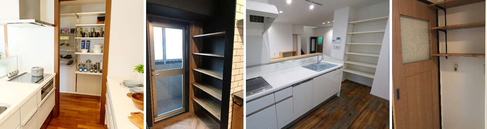 スペースがなく大きな収納(パントリー・クローゼット)を設けられなくても、小スペースで奥行の浅い収納や飾り棚を作ることもできます。キッチン・リビング・洗面室・トイレなど。収納するものによって高さを変えられるような可動式の棚などを設けることも出来ます。見せる収納として使用するのもオシャレです。