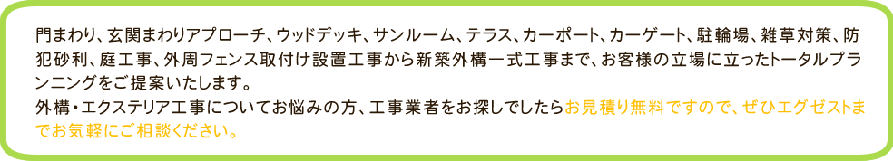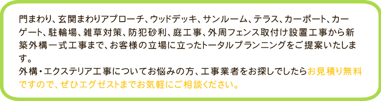 門まわり、玄関まわりアプローチ、ウッドデッキ、サンルーム、テラス、カーポート、カーゲート、駐輪場、雑草対策、防犯砂利、庭工事、外周フェンス取付け設置工事から新築外構一式工事まで、お客様の立場に立ったトータルプランニングをご提案いたします。外構工事・エクステリア工事はエグゼストにおまかせください。