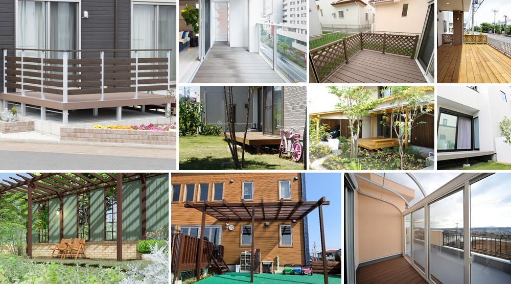 戸建住宅のお庭にガーデンリビングとして家族の集まる空間を。雨の日も洗濯物が干せるサンルームやメンテナンスフリーの木質樹脂デッキなどもあり、また公共施設や商業施設、マンション等のバルコニーもやさしい空間を演出するバルコニー専用のウッドデッキや、お庭にテラス(パーゴラ)で木調のぬくもりを感じ憩いのスペース作りをしてみませんか?ウッドデッキの上にデザインや目隠しとしてフェンスの取付けをすることで家族だけの空間にもなります。
