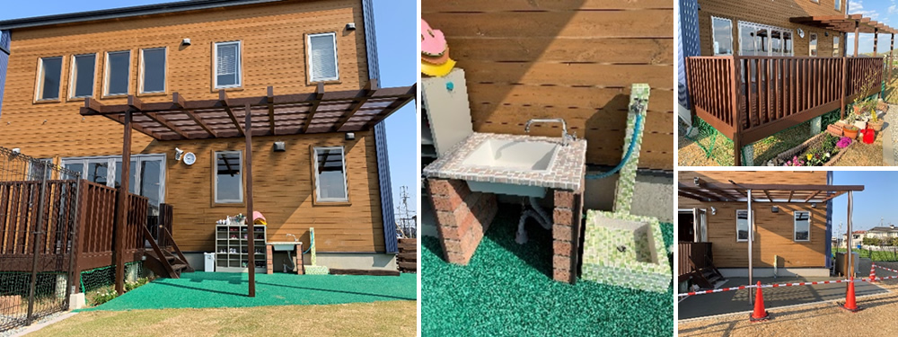 園児の手洗い・足洗場も設置し、ウッド調テラス(パーゴラポーチガーデン)も取付けました。