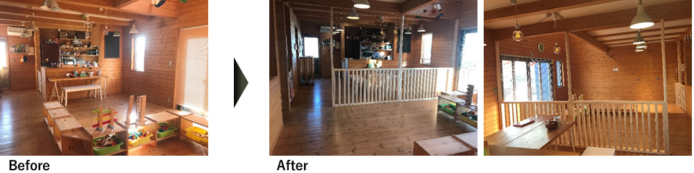 保育室は食事スペースとの間仕切り、玄関出入り口の間仕切り扉が必要との事で間仕切り造作工事を行い、さらに既存の土間の床上げを行いフローリングを張ったので室内スペースも広がりました。
