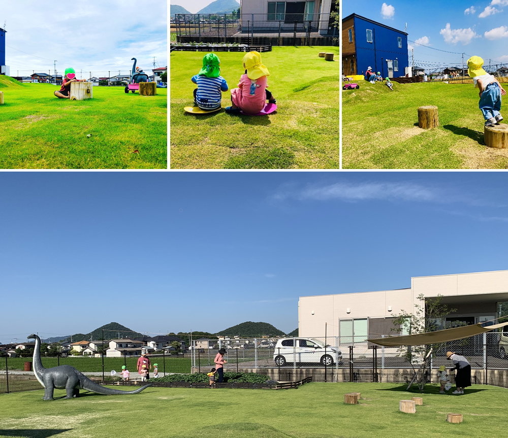 2か月後です。芝も青々とし、転んでも痛くない芝は走ったりジャンプしたりと園児達にとって最高の園庭となっているようです。